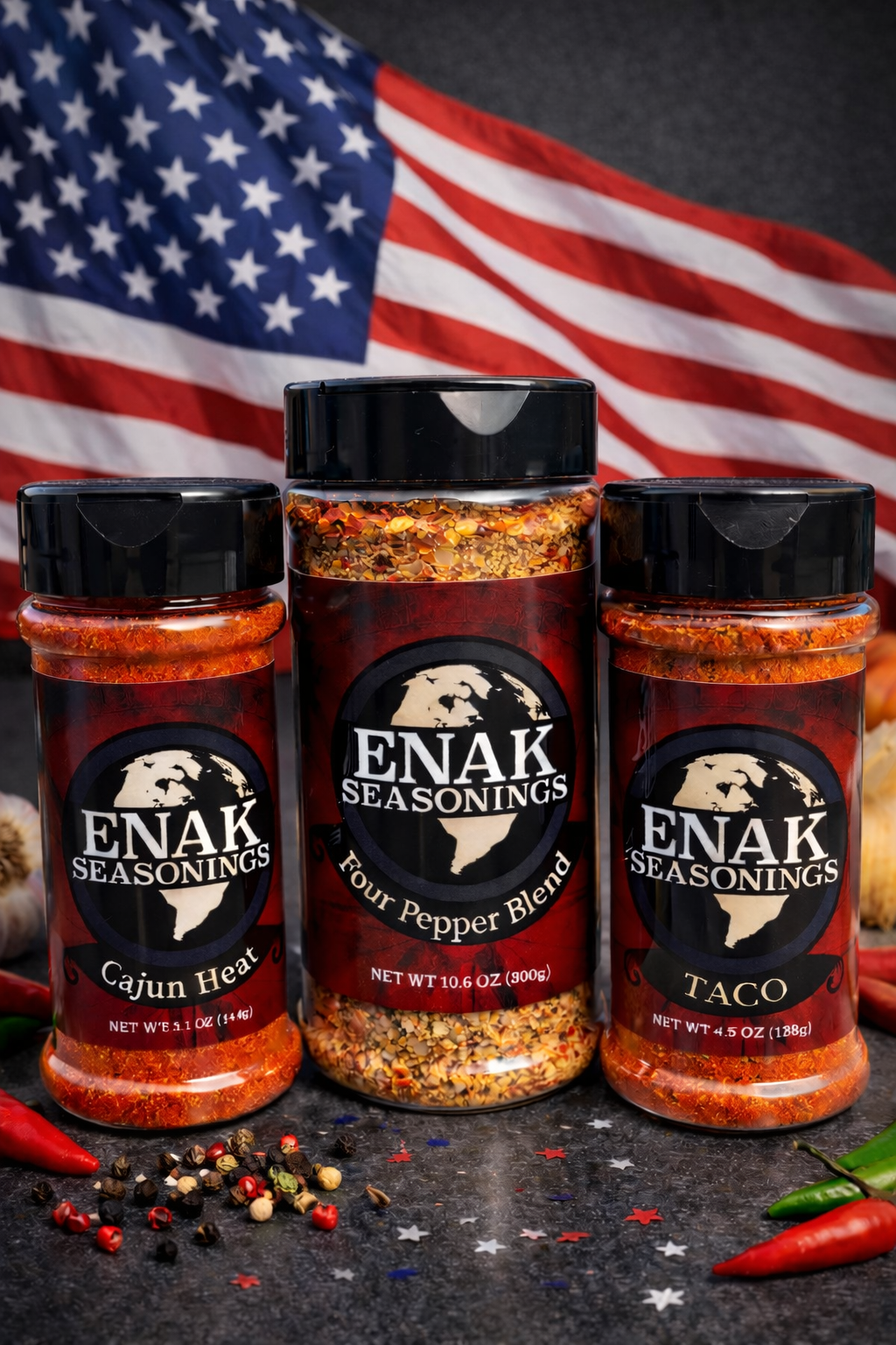 Our three North American flavors bundled into one offer! Get a large Four Pepper Blend - the bestseller and staple blend - along with a Taco seasoning and Cajun Heat.